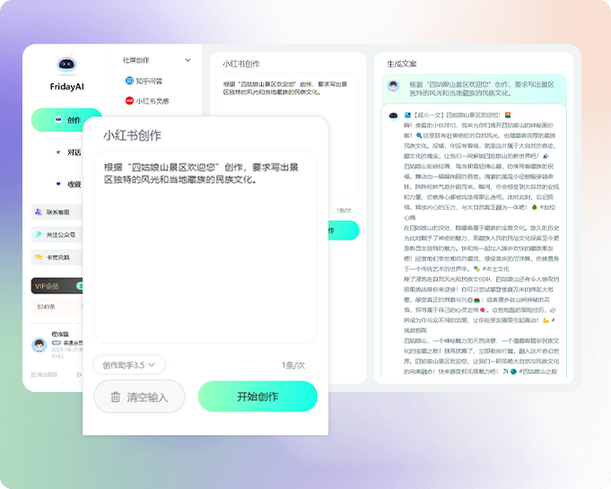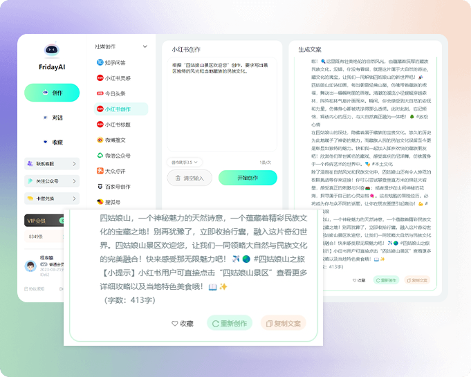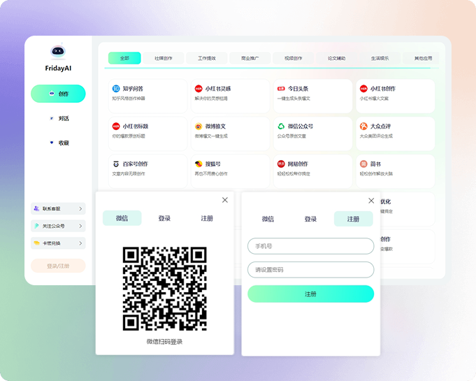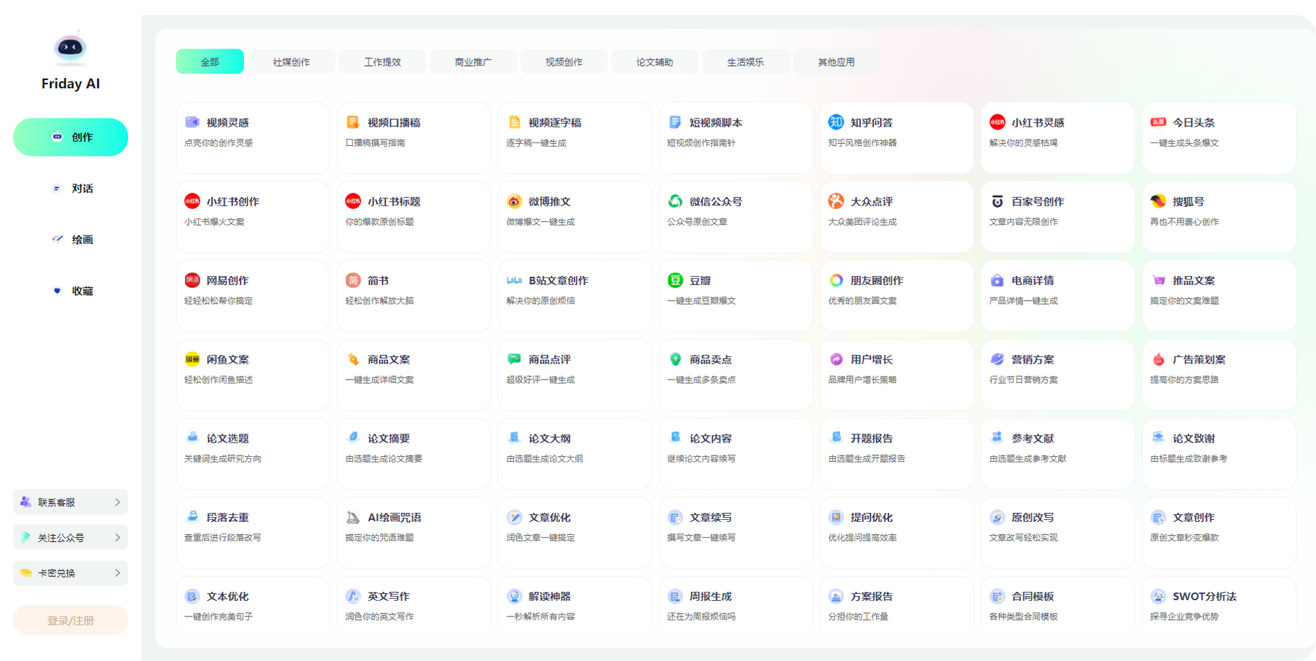 原创AI文章生成 小红书爆款笔记创作 朋友圈广告文案 工作总结/述职报告 种草文案/短视频脚本